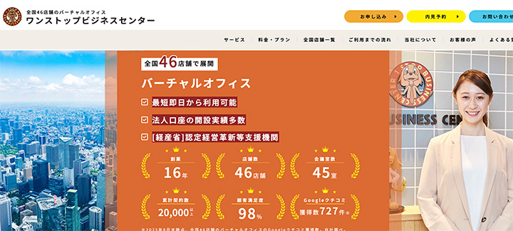 ワンストップビジネスセンターは、全国46店舗・累計2万件以上の契約実績を誇る老舗バーチャルオフィスです。