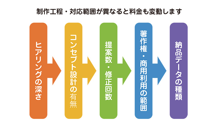 また、コンセプト設計の有無や初回提案数・修正回数、著作権や商用利用の扱い、納品データの種類も料金に大きく影響します。