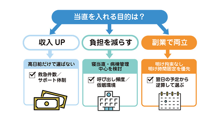成功のコツは、翌日の予定から逆算して当直の種類を選ぶこと、そして条件を絞ることです。