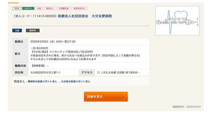 業界トップクラスの求人数を誇り、外来・病棟管理・当直など幅広い精神科求人を取り扱っています。