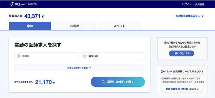 求人案件は、40,000件以上と業界最大級。上場企業の産業医や製薬企業のメディカルドクターなど、一般ではなかなか見つからないような非公開求人も充実しています。