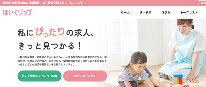 ほいくジョブは、保育士や幼稚園教諭向けの求人を専門に扱う転職支援サイトです。