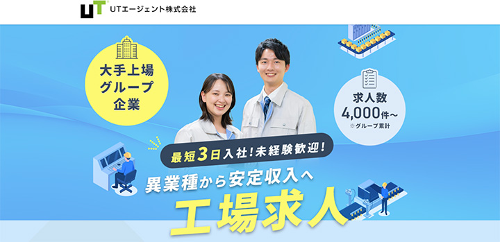 UTエージェントは、大手上場グループ企業で、工場求人に特化した人材エージェントです。