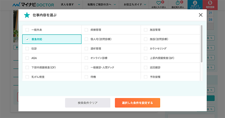 一般的な求人サイトと違い、医師向けサービスでは救急外来や当直など専門性の高い求人が多く掲載されています。