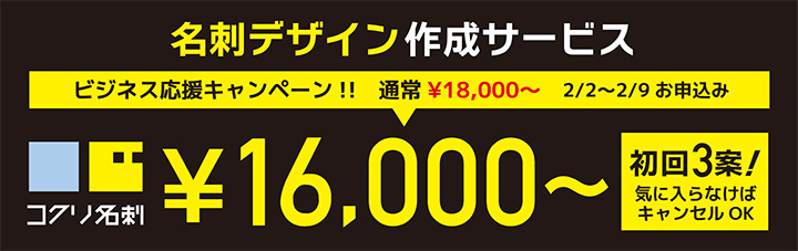 | 制作料金(1名分) | 片面デザイン:¥16,000(税込) ↑ビジネス応援キャンペーン実施中!通常18,000円 両面デザイン:¥25,000(税込) 初回は名刺デザインを3案提案。気に入らなければキャンセルOK。 ただし、キャンセルは初回の提案時のみとなります。 合計2回まで修正対応いたします。 追加修正は別途1回につき3,000円頂戴いたします。 |